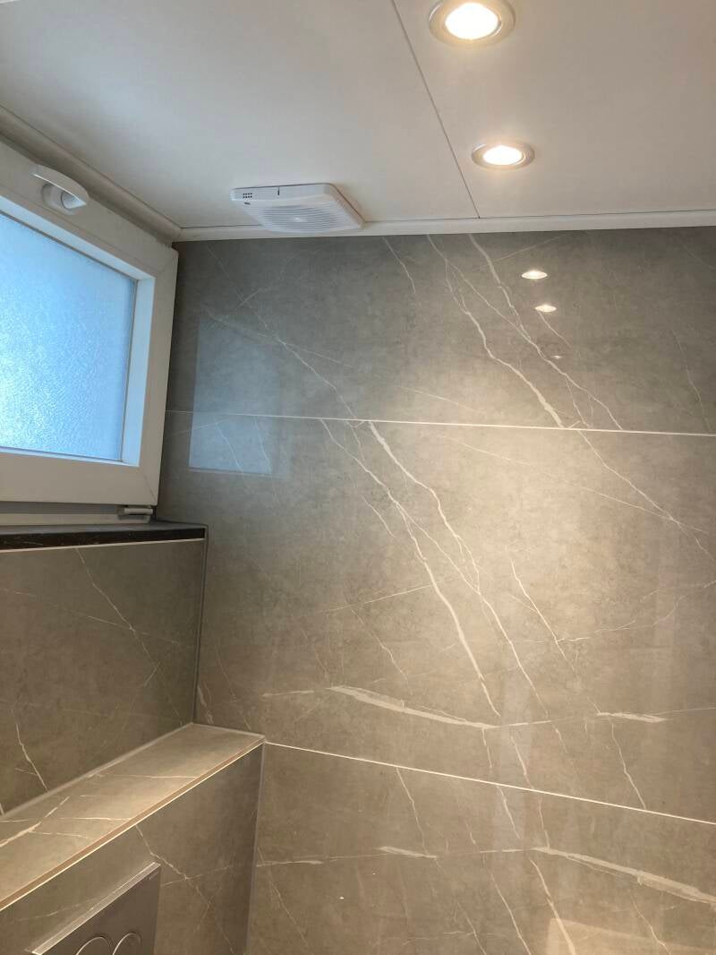 De combinatie van grootformaattegels, strak stuckwerkenzojgvuldig geplaatste sanitaire voorzieningen zorg voor een tijdloos en onderhoudsvriendelijk resultaat.
